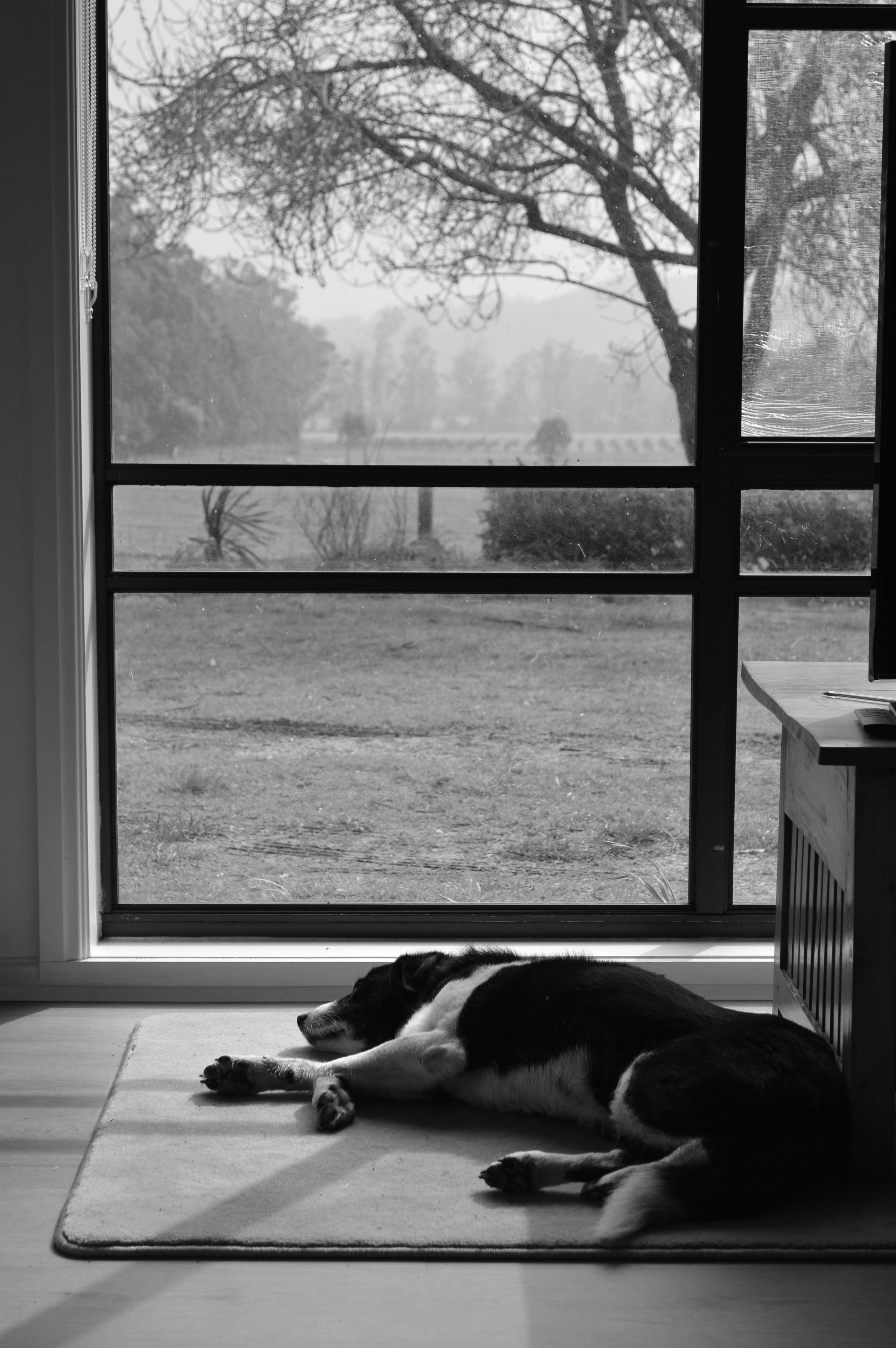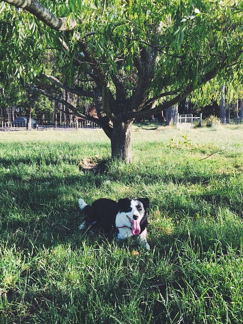 As Alice has gotten older she’s stopped jumping fences. Now she lies on the grass under the pepper-berry tree and gazes north towards the road where our son will appear in his Ute if he’s coming home. Dogs can recognise the smell of their family’s car from a couple of miles away. She can’t see it or hear it, but she knows when he’s on his way. My son is eighteen and spends most of his time at his girlfriend’s place now. Gone are the years when Alice would go up to his room at bedtime and lie on the carpet beside his bed, keeping guard while he went to sleep.