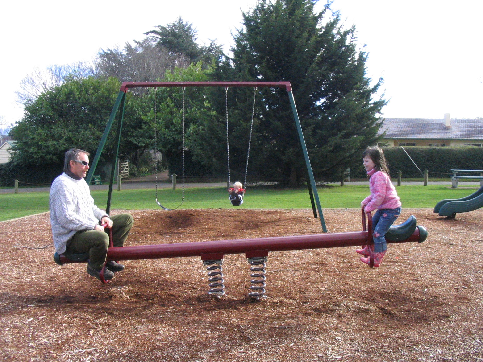 So we got back into the car and drove back the way we had come. Dipping down into Golden Valley we left the snow clouds behind and emerged into rich sunshine and green farmland. Stopping at Westbury we parked up alongside Australia’s oldest village green. At one end there was a set of village stocks where people were taunted cruelly in a former age. Further along the green was a small playground. There we spent an hour with the children playing on swings, slides and flying foxes. We dressed Kit in a fresh jumper and warm pants and he promptly got them filthy in the woodchip of the playground, his third outfit in as many hours, but it didn’t matter.