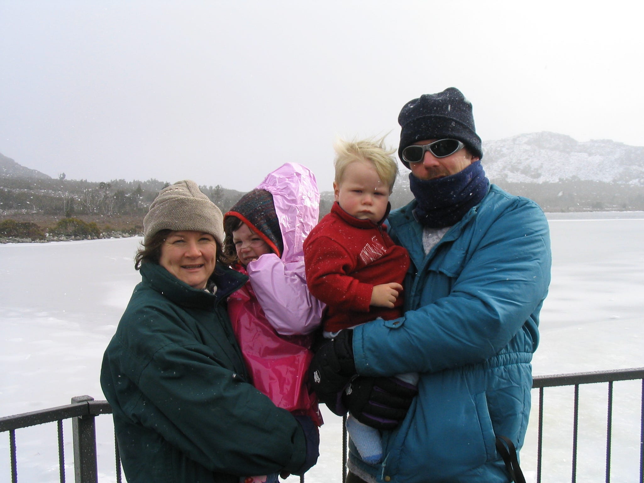 Each year I had begun using one of our family photos as a Christmas card, to give friends and relatives back home an image of us in the Tasmanian landscape. Our Pine Lake photos were an obvious choice that year, with the four of us posed against a frozen backdrop. Oliver wore sunglasses against the glare of the snow clouds, and a fleecy scarf over the rest of his face. Kit had grown very grumpy at being confined to his pram and scowled in Oliver’s arms with livid, cold cheeks. Daisy beamed beside them. Behind us lay the lake, an eery, white expanse with thick snow clouds banked up beyond.