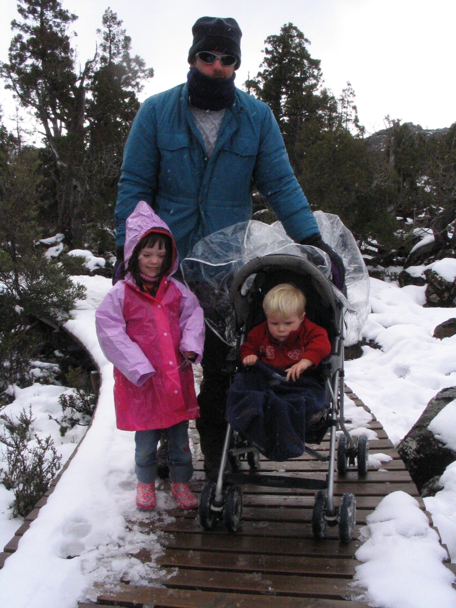 It was an austere and very Tasmanian environment. Pencil pines can survive for thousands of years but the harsh conditions on the highlands stunt their growth. Often they assume twisted shapes as if tortured by the bleakness of where they live. It’s a haunted kind of landscape. The boardwalk passed by some of these pines and over a rocky grassy plain, ending up at a lookout. Here we were directly over Pine Lake, which was frozen over with a thick layer of white ice. While we took in the frosty view, the wind whipped at our cheeks and numbed our lips. Another family was on the lookout platform, and with frozen fingers we fumbled with our cameras and took some photos for each other.