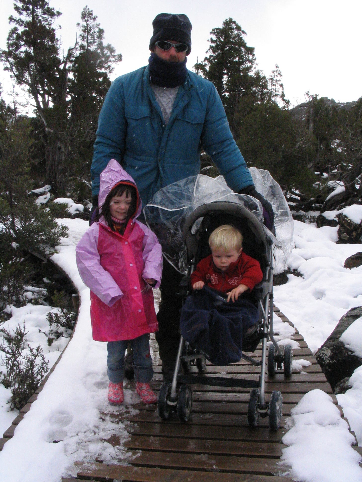 Staying in the warmth of the car, we opened up the picnic box and passed round sandwiches and crackers stuffed with creamy cheese. Outside, a sudden blizzard took place. It was a splendid show watched through the TV screens of the car windows, with flurries of snowflakes and wind swirling all around. We ate our sandwiches and oo-ed and ah-ed in wonder. Miraculously, as we finished lunch and dusted the crumbs off our jumpers, conditions cleared. We jumped out of the car again and put on all the warm, dry layers we could find in the boot. While the snow had stopped, there was still low cloud and a frigid mountain wind. We put Kit in the pram with a clear plastic cover creating a warm little capsule for him, and headed along the boardwalk.
